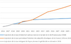 Le graphique ci-contre montre à quoi grâce aux Gilets Jaunes les Français ont échappé, du moins jusqu’à présent. Il est repris à l’ADME. La courbe orange concoctée par ses services est censée indiquer la progression des montants de la taxe qu’il faudrait imposer pour obtenir une diminution de 40% des émissions de GES ( à condition qu’elle soit conjugué avec les autres mesures du projet de Stratégie Nationale Bas Carbone 2 !) . La courbe en bleue donne la trajectoire du projet de loi des finances pour 1998 qui a capotée suite au soulèvement des Gilets Jaunes et la courbe en gris, la trajectoire de cette taxe depuis.
